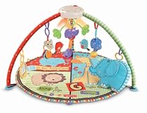 Oh Fisher-Price Luv U Zoo Deluxe Musical Mobile Gym kind of dangerous, and cheapBy Sarah LamotheSo we spent sixty dollars on this thing, and I kind of hate it. The hanging toys are all very heavy, the three interlocking monkeys fell on my sons head and each one has to weight half a pound, if not more. the other hanging toys are also heavy and cumbersome, my three month old doesn't have great hand coordination yet and I feel like he raps his knuckles on the stupid rattle a lot. The fabric birds could have had crinkle in them, but F.P. skimped on that (not surprising). The mat design is also not that inspiring or fun. All in all this thing is at the bottom of the baby play gym genre. Oh, also, the lights can't blink at the same time as the mobile spinning...lame1 of 1 people found the following review helpful. »»
